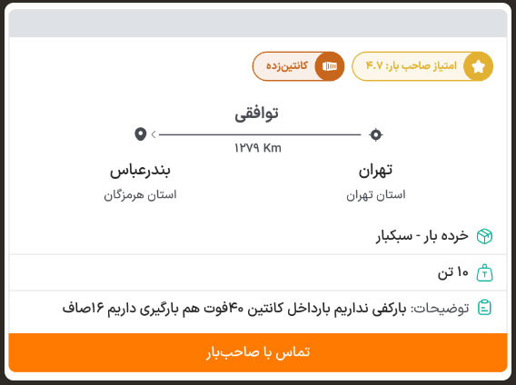 مسافت مبدأ تا مقصد 1279 کیلومتر است و وزن خرده بار به 10 تن می‌رسد. امتیاز کسی که این درخواست را اعلام کرده 4.7 است که نشان می‌دهد راننده‌های ماشین سنگین از عملکرد قبلی این شخص به طور نسبی رضایت داشته‌اند.