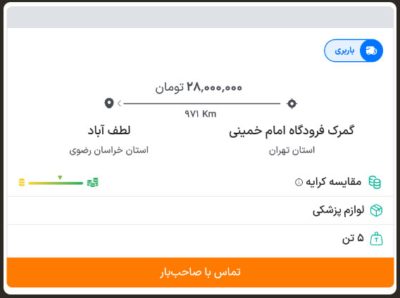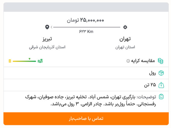 کسی که درخواست تریلی برای حمل بار داشته در این آگهی، کرایه این اعلام بار را 25 میلیون تومان در نظر گرفته است. ویژگی مقایسه کرایه در این اپلیکیشن نشان می‌دهد که عدد کرایه پیشنهاد شده به نسبت از میانگین کرایه اعلام شده در آگهی‌های مشابه 15 روز گذشته بالاتر است.