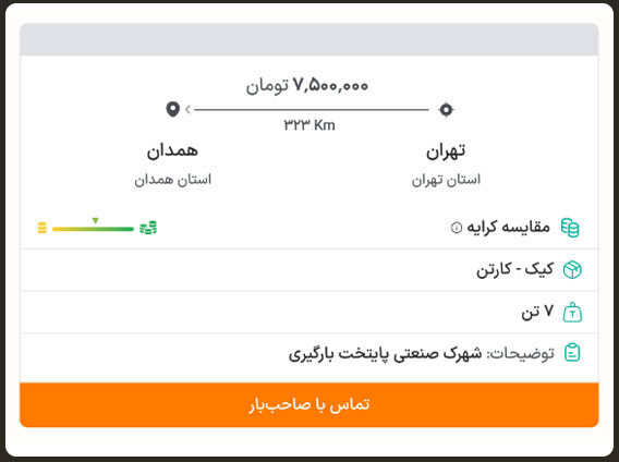 مبدأ شهر تهران و مقصد شهر همدان انتخاب شده است. وزن بار 7 تن است و کرایه‌ای که برای پیمودن 323 کیلومتر مسیر تعیین شده 7 میلیون و 500 هزار تومان است. آدرس دقیق بارگیری نیز شهرک صنعتی پایتخت است.