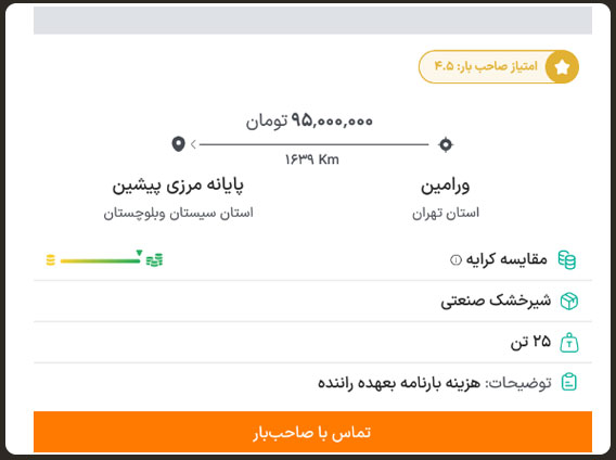 مسافتی که راننده باید طی کند 251 کیلومتر است و کرایه‌ای که صاحب بار برای این مسیر در نظر گرفته 10 میلیون تومان است. بخش مقایسه کرایه نیز نشان می‌دهد که کرایه تعیین شده تقریبا مساوی با میانگین آگهی‌های مشابه در دو هفته گذشته است.