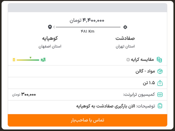 مسافت این مسیر 481 کیلومتر است و مبلغ کرایه‌ای که برای آن تعیین شده 4 میلیون و 400 هزار تومان است. در اینجا صاحب بار می‌خواهد، محموله مورد نظر با نیسان روباز حمل شود.